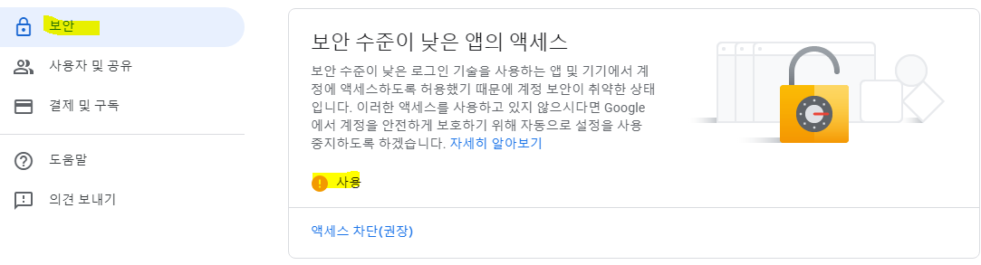 구글 계정 로그인 -> 보안 -> 보안 수준이 낮은 앱으로 엑세스를 사용