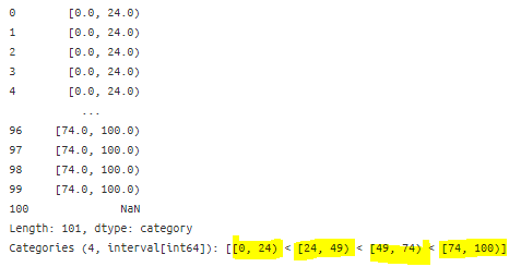 pd.cut(pd.Series(range(101)),
