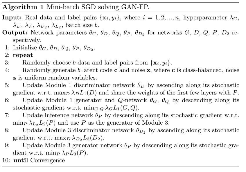 3. 생성된 샘플과 레이블의 일치성을 확인하기 위한 두 번째 GAN의 Discriminator Network를 따라서 추론 네트워크(P)를 업데이트 이렇게 해서 추론 네트워크 P의 분류하는 검정력을 증가시킴