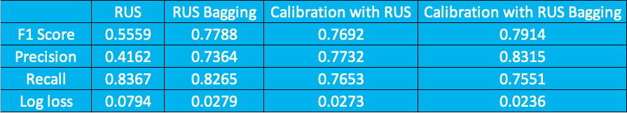 만약에 threshold를 수정한다면 더 나은 결과를 얻을 수 있을 것이다. RUS Model에서 calibration 전과 후에 threshold는 0.99 calibration with RUS Bagging 은 0.8로 설정하면 다음과 같은 결과를 얻을 수 있다!