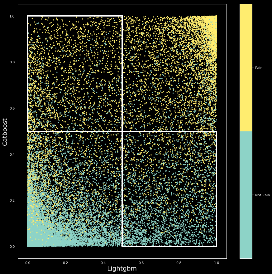EX) 한 행에 대해서 catboost 모델은 비 올 확률 0.9 lightgbm 모델은 0.1과 같이 상이하게 예측하는지 확인하기 위해