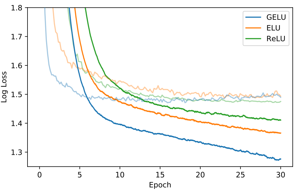 여러 가지 실험 결과에서 GELU가 다른 알고리즘들 보다 더 빠르게 수렴하고 있는 것을 알 수 있다.