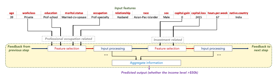 - Constructing a sequential multi-step architecture, where each decision step can contribute to a portion of the decision that is based on the selected features.
