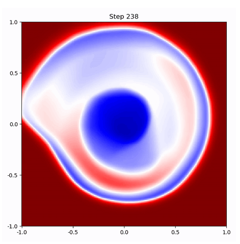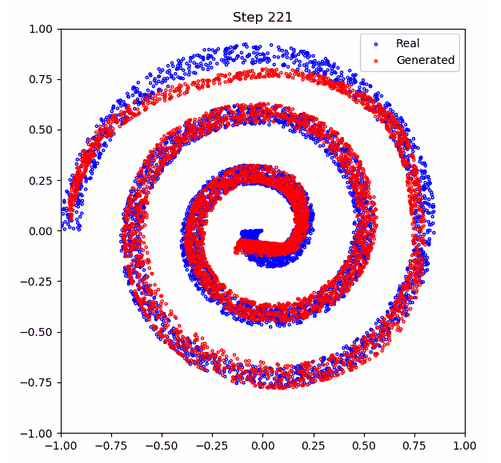 모든 training step 후에 실제 분포(파란색)와 생성된 분포(빨간색)를 시각화했다.