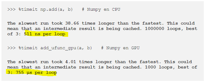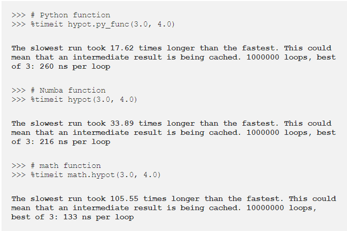 그러나 다른 것에서 Numba 함수를 호출하면 오버헤드가 거의 없으며, 컴파일러를 다른 것과 통합하면 0도 된다. 간단히 말해서, Numba로 기능이 정말로 가속되고 있는지 확인한다