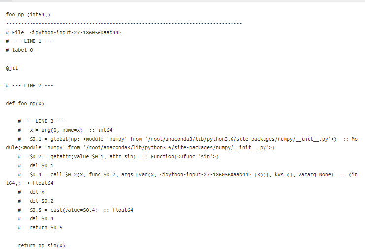 파이썬의 각 라인에는 여러 줄의 Numba IR 코드가 선행한다.