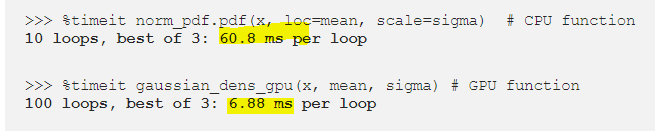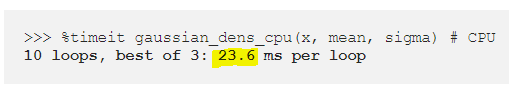 이것을 염두에 두고, 이전 포인트에서 배운 것을 적용하여, CPU보다 GPU에서 운용하는 것이 정말 빠른지 알아보려고 노력해보면 다음과 같다.