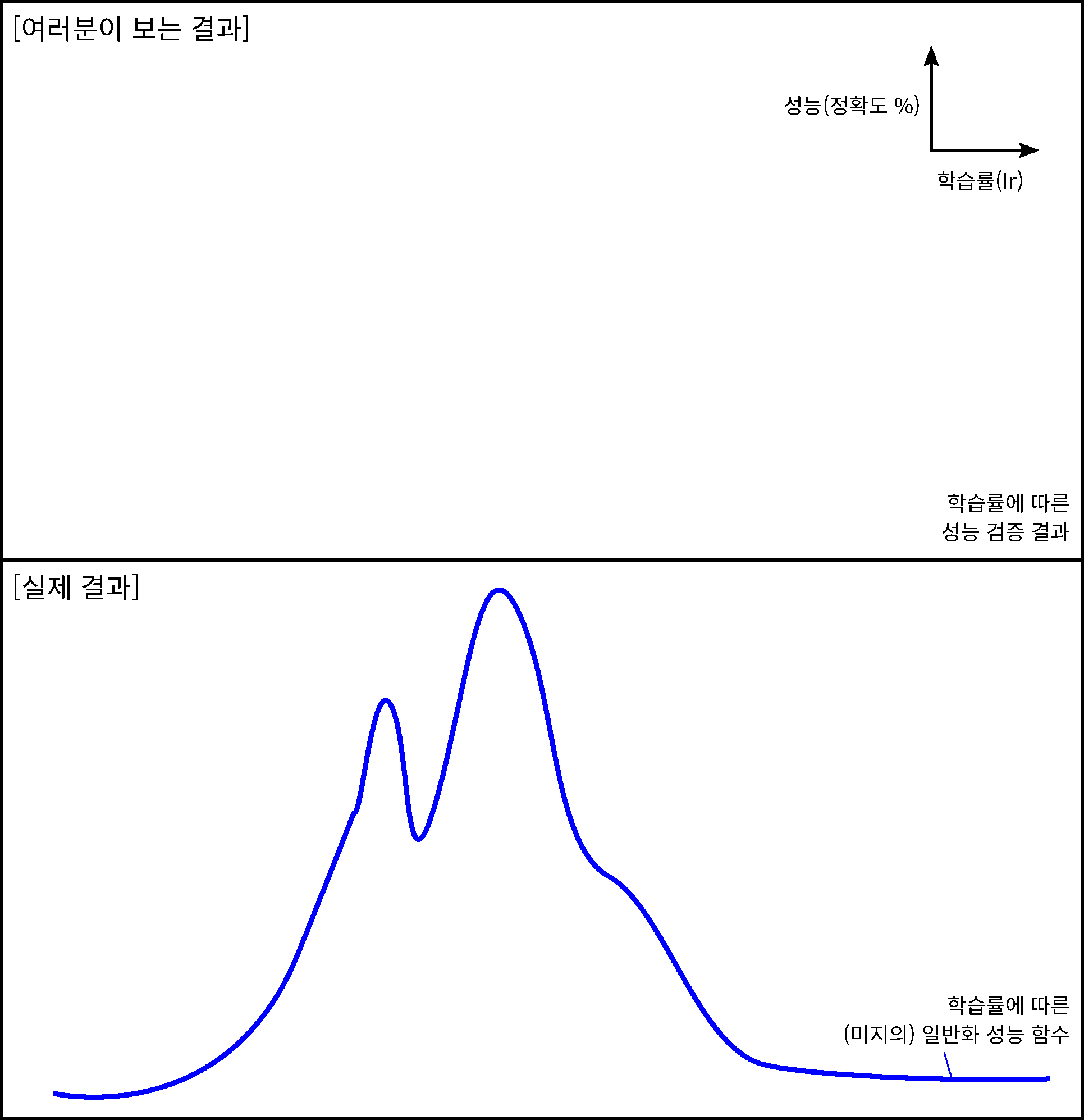 아래 그림 중에서 밑에 실제 결과라는 부분은 learning rate에 따른 일반화 성능 함수를 나타낸다.