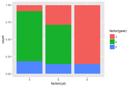 ggplot(mtcars,aes(x=factor(cyl),fill=factor(gear)))+