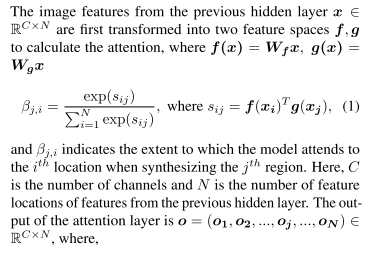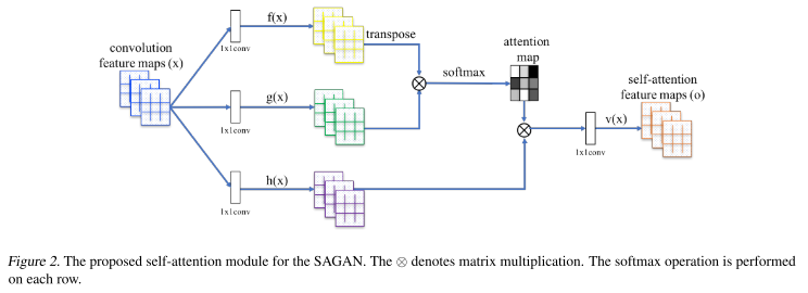 self-attention은 convolution을 보완하고 그리고 먼 거리에 있는 모델링에 도움을 주며, 이미지 영역 사이에서 다중 레벨 의존성에도 도움을 줄 수 있다.