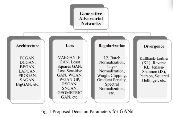 이 논문에서는 크게 architecture, loss , regularization, divergence를 기반으로 특정 사용 사례에 대한 후보 GAN을 식별하기위한 새로운 프레임 워크를 제안한다고 함.