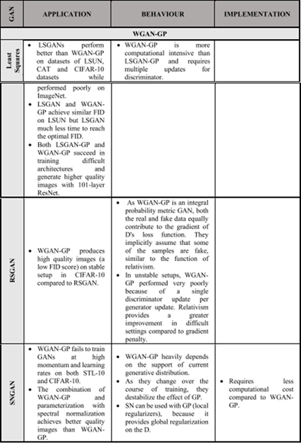 - As the application requires high sample diversity and quality, the study suggests WGAN-GP, Least Squares GAN, RSGAN and SNGAN models. The combination of least squares GAN with relativism produces higher quality images compared to the independent models. Regularized models such as Loss Sensitive GAN and SNGAN demonstrate better generalization across distributions.