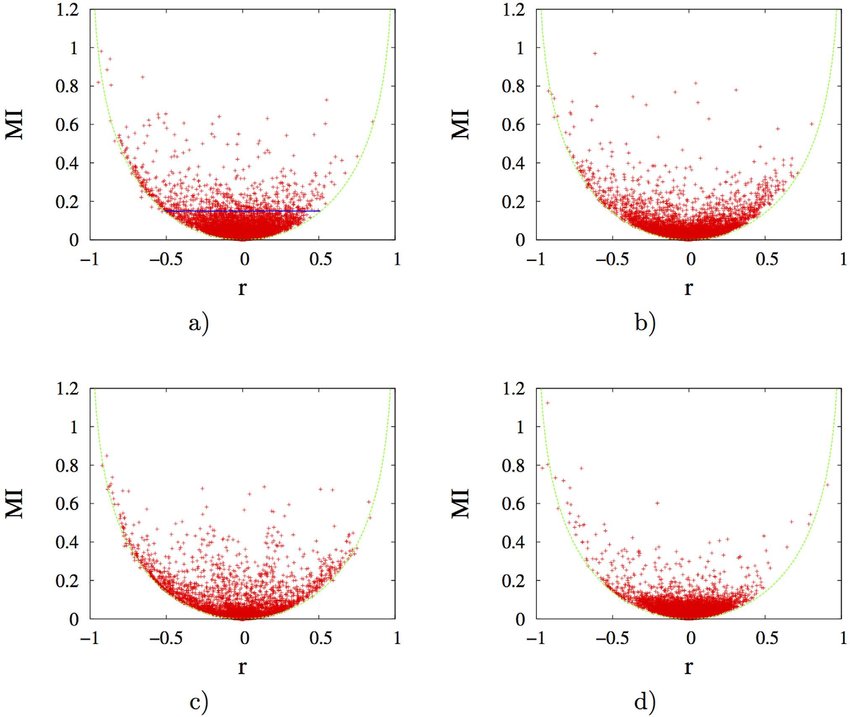 Mutual Information 같은 경우, 일반적이며 X를 관찰한 후 Y의 불확실성 감소를 측정한다. 이것은 결합 밀도 함수와 개별 밀도 함수의 곱 같이 KL dIvergence를 의미한다. 따라서 MI는 비 단조 관계나 더 복잡한 관계까지도 측정이 가능하다는 것이다.