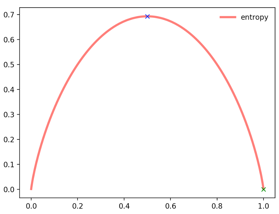 이것을 확률 값을 0에서 1 사이에서 계산을 하게 되면 다음과 같은 정보를 얻게 되고, 직관에서 알 수 있듯이 0.5에서 entropy를 가장 많이 얻을 수 있게 됩니다.