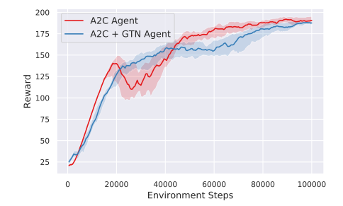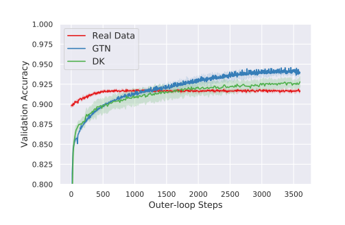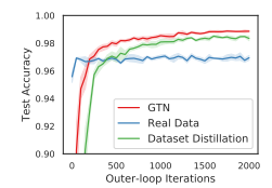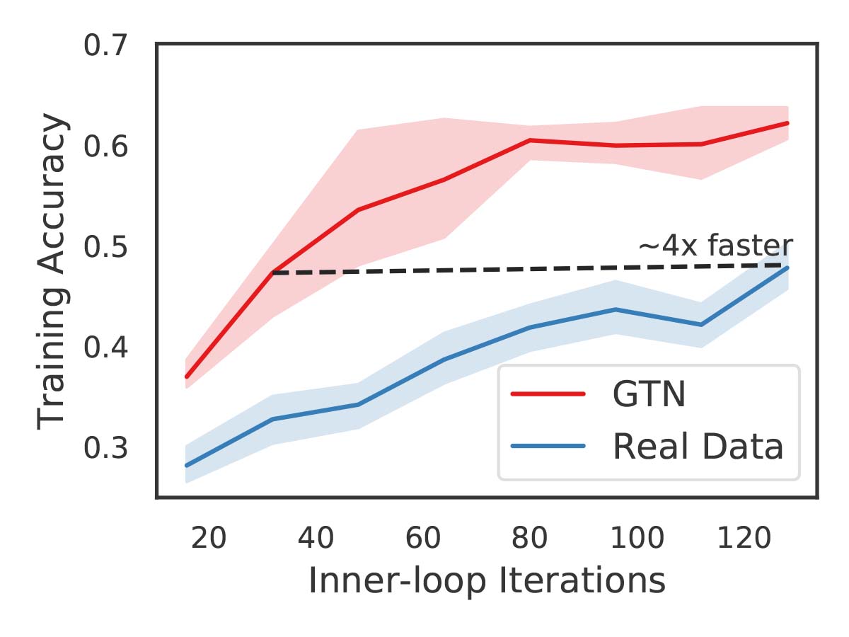몇 번의 반복 후에, GTN을 사용하여 훈련된 새로운 learner는 실제 데이터를 사용하는 동일한 모델보다 빠르게 학습할 수 있었습니다.