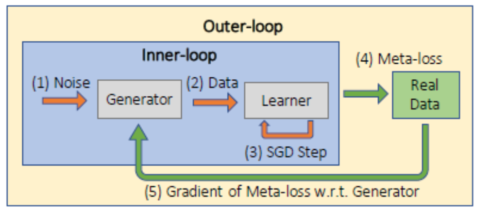 - generator의 파라미터들의 gradients는 generator를 업데이트 하기 위해서 meta-loss에서 수행됩니다.