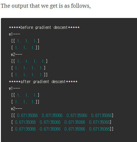 다음에 w2를 matrix 곱을 해서 학습시키는 코드까지 만들면 다음과 같다.