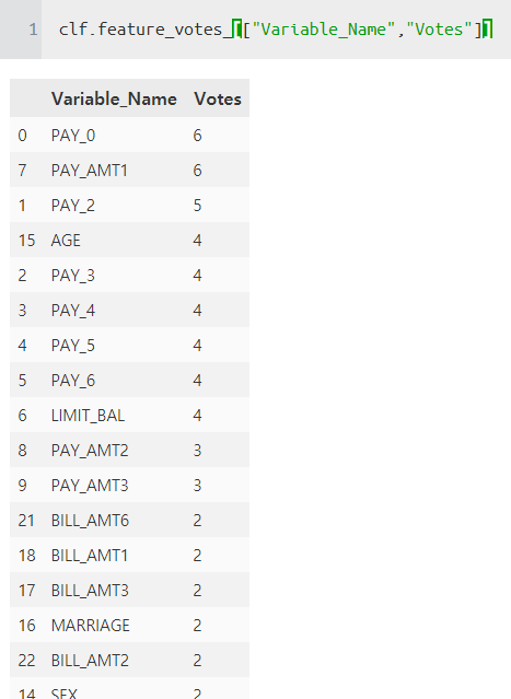 여기서 Voting 결과를 확인해보자. 그러면 PAY_0 , PAY_AMT1은 6개의 알고리즘에서 중요하다고 나온 것을 확인하였다.