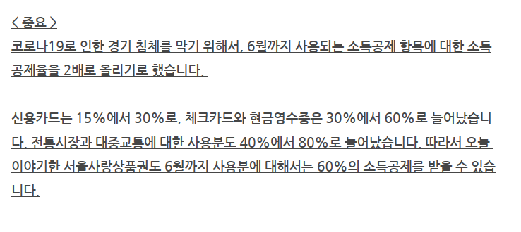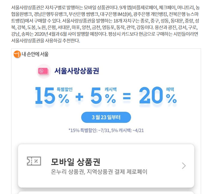 코로나 바이러스로 인한 서울사랑상품권 20% 할인 (15% 특별 할인 5% 캐시백)