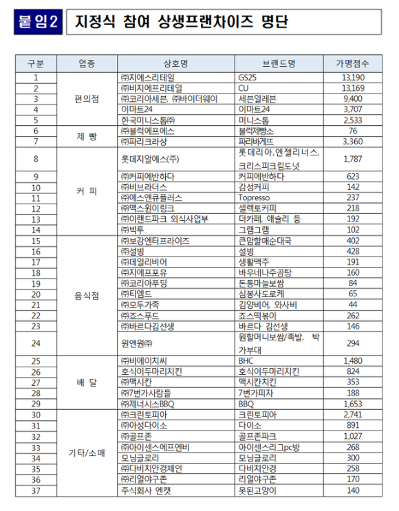 37개 상생프랜차이즈