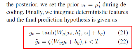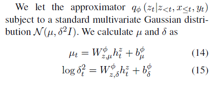 stochastic factor를 잘 통합하기 위해 recurrent, continuous latent variables으로 모델링한 latent driven factors를 생성VAE에서 영감을 받아서 end-to-end 훈련을 위해 recurrent variational lower bound를 이끌어 냈고, 참신한 decoder 네트워크를 제안함.