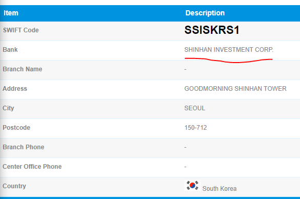 하지만 위의 블로그에는 한글 이름과 SWIFT 코드만 알려줍니다.