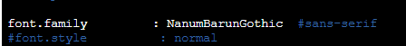 안에 있는 파일 중에서 font.family를 찾아서 위에 있는 것 중에 하나로 써주고 저장