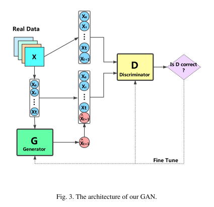 그림 3을 봤을 때 $\hat x_{t+1}$ 와 $x_{t+1}$ 만 넣지 않고 $x_0, x_1 ,... x_t$까지 넣는 이유는 $x_{t+1}$와 $X$사이에서 시계열적인 정보와 상관관계를 discriminator가 포착하길 기대하기 위해 저런 식으로 구성했다고 한다.