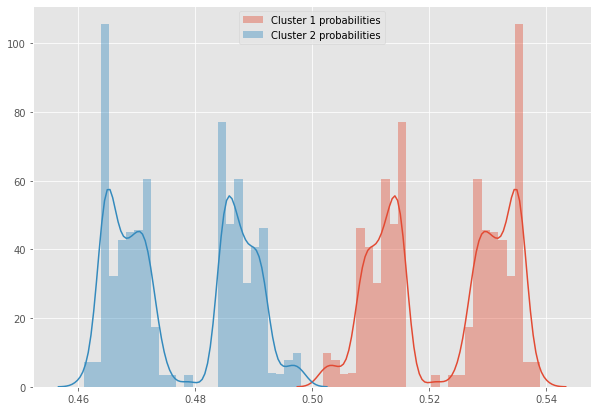 실제로 예제를 만들 때 $P(cluster=1|x) ==P(cluster=2|x)$로 했으니, 어느 정도 만족하는 결과일 수도 있다.