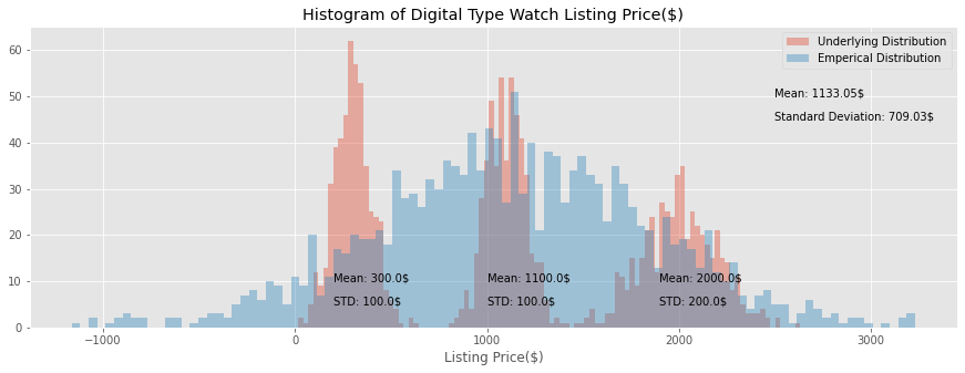 아래 그림이 디지털 시계의 목록 가격의 분포라고 하자.