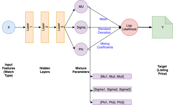 MDN은 GMM과 동일한 우도 함수를 최적화하고 데이터 세트의 각 샘플에 대해 mu, sigma 및 phi를 출력한다.