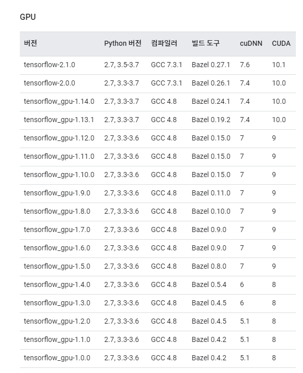 텐서플로우 유저이기 때문에 각 텐서플로우 버전마다 호환되는 버전 확인