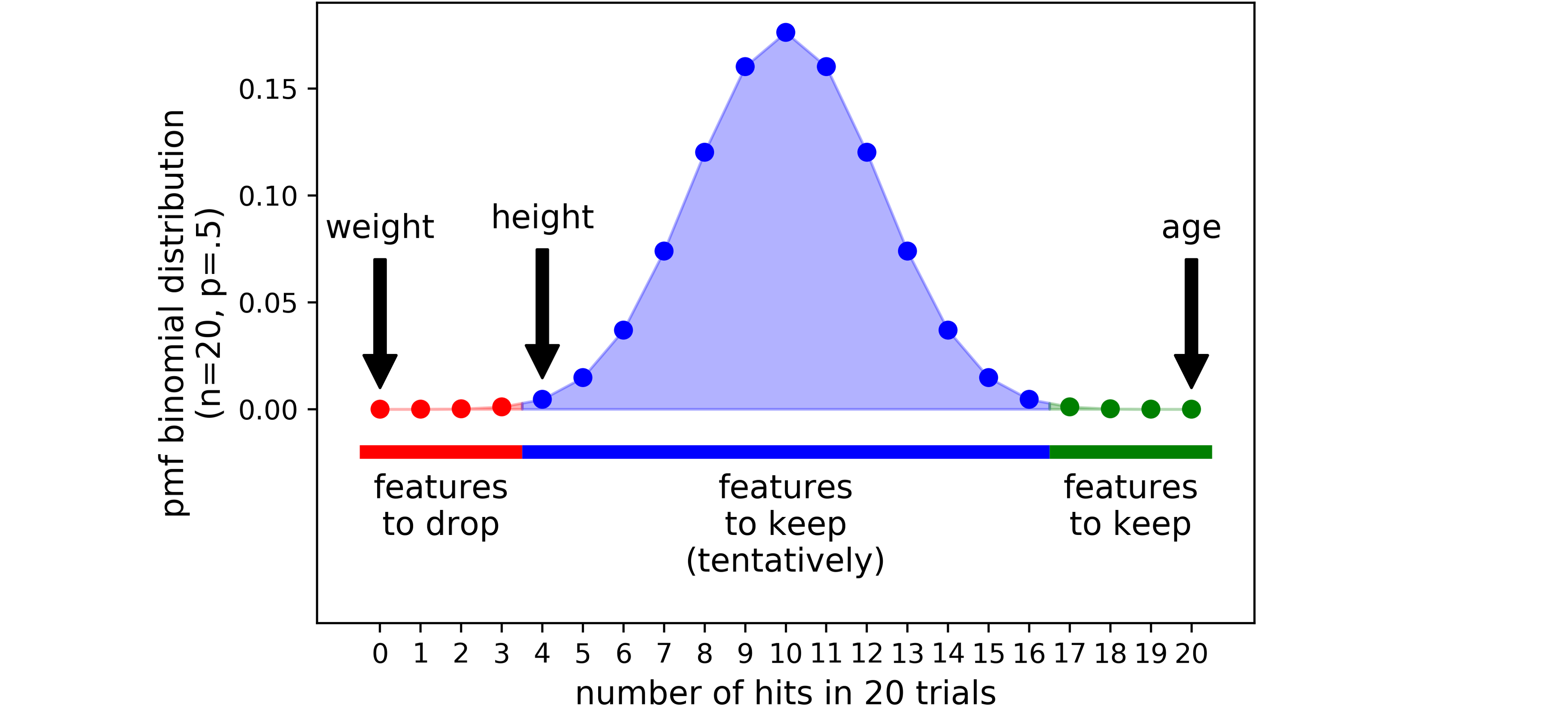 - an area of acceptance (the green area): the features that are here are considered as predictive, so they are kept.