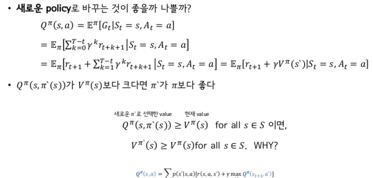 이렇게 기존 정책 함수를 탐욕적(greedy)하게 함으로써, 기존 정책보다 좋아지게 만드는 과정을 Policy Improvement라고 한다.