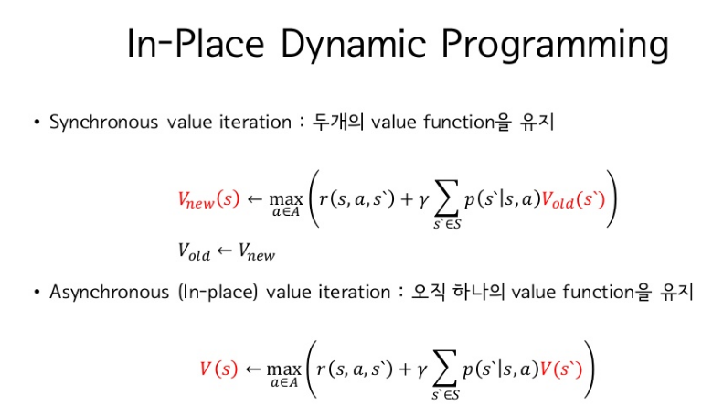 비동기 동적 계획법은 상태 집합에 대해서 일괄 계산을 하지 않고 개별적인 (in-place) 반복 DP 알고리즘임