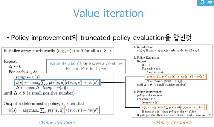 그래서 Value Iteration에서는 Policy Iteration 1 STEP + Policy Improvement이기 때문에 한 번의 업데이트를 하는 것을 알 수 있음