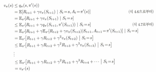 만약 식 4.7을 만족한다고 가정한다고 했을 때, 의미는 state에서 value function에 대한 action에 대한 평균값보다 새로운 정책을 취했을 때 state action value function이라는 가정이다. 이것의 평균에 의미해서 충분히 와 닿는 가정인 것 같다. 이제 그러면 이것을 t+1 시점에서도 t+2 시점에서도 쭉쭉쭉 적용한다면, 실제로 4.8을 만족하는 식이 나올 것이다.