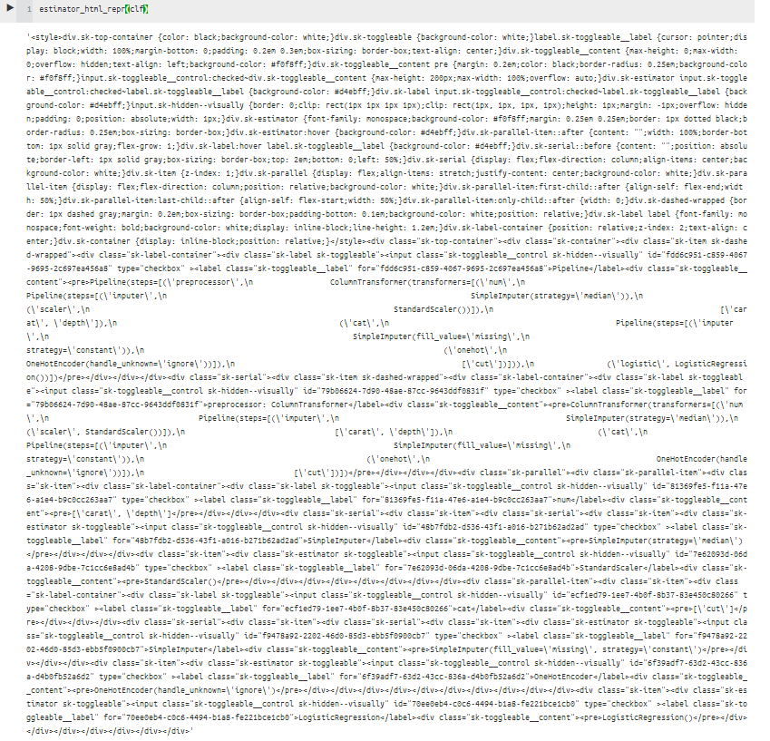 위에 estimator_html_repr를 사용하면 html을 만들어준 것을 알 수 있다. 이제 이것을 저장한다면 재사용할 수 있으니 저장해보자.