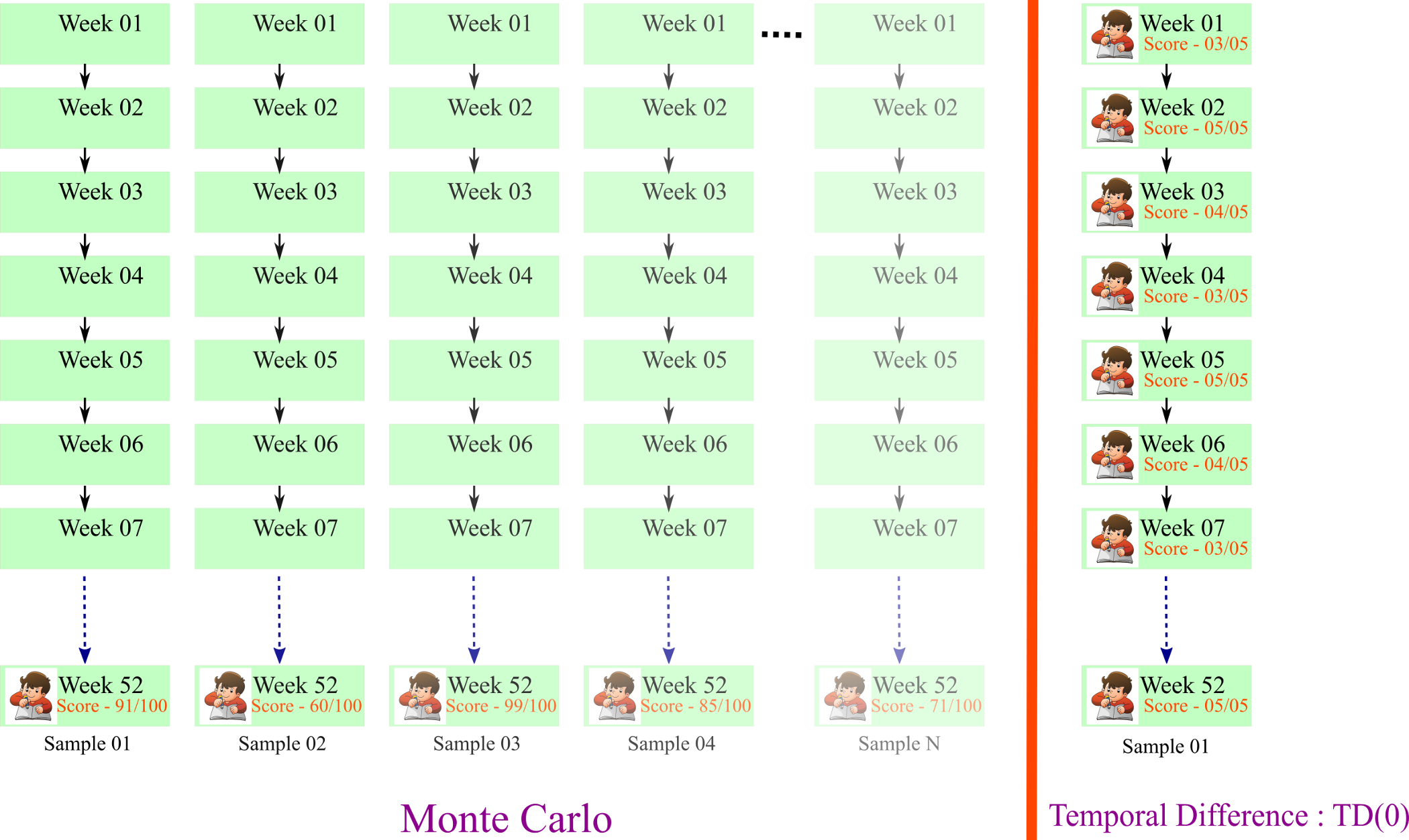 - 항상 에피소드가 종료가 되야 가치를 업데이트할 수 있습니다.(에피소드가 완료된 후에 업데이트하기 때문에 수렴 속도가 느립니다.)