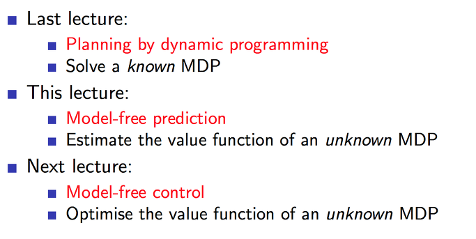 Prediction은 가치(value)를 estimate(추정)하는 것을 말하는데, model-free에서 prediction은 MDP를 모르는 상태(즉 환경에 대한 사전 지식이 없는 상태)에서 환경과 상호 작용하여 가치 함수(value function)를 estimate(추정)해가는 방식을 말합니다.