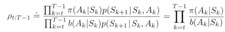 여기서 $p$ 는 상태 전이 확률 함수입니다. 따라서 target policy와 behavior policy 상태-행동 궤적(trajectory)의 상대적인 확률은 다음과 같습니다.