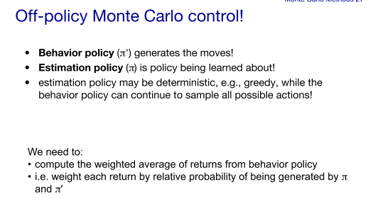 여기서 보통 제어 문제에서 적용한다면 behavior policy는 stochastic 하고 target policy는 deterministic 한 policy일 것이다. 그래서 behavior policy가 target policy를 닮아가게 하기 위해서 importacne sampling 방법을 사용합니다(즉 어떤 분포로부터 얻은 표본이 주어진 경우 그 표본을 이용해서 다른 분포에서 기댓값을 추정하는 방법)