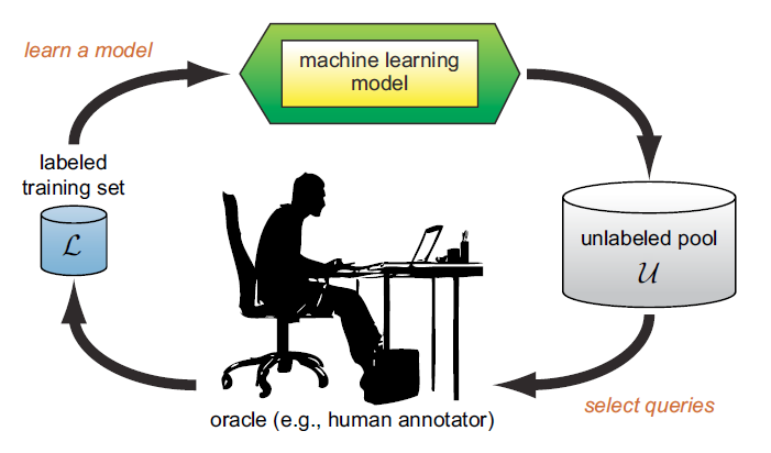 위의 사진은 pool-based active learning의 과정의 생생한 표현을 한 것이다. 여기서 인간 전문가는 "oracle"이라고 불린다. 이진 분류 예에서, 쉽게 왜 레이블을 위해서 몇개의 구체적인 데이터셋을 선택하는지 시각화할 수 있고 이해할 수 있다.