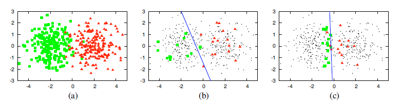 a는 large pool of unlabeled dataset를 표현한다. 지금 만약 우리가 훈련과 레이블링을 위해서 몇 개의 샘플들을 랜덤 하게 선택한다면, 그 알고리즘은 그림 b처럼 deicision boundary를 예측할 것이다.