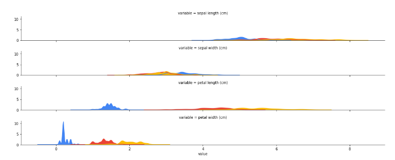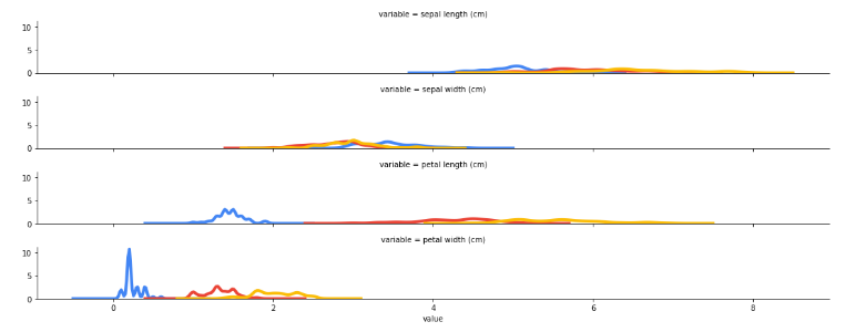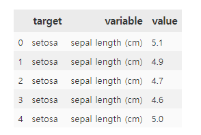 일단 처음에 sepal length ~ petal width까지 한 번에 시각화하기 위해서 wide 포맷에서 long 포맷으로 변경을 해준다.