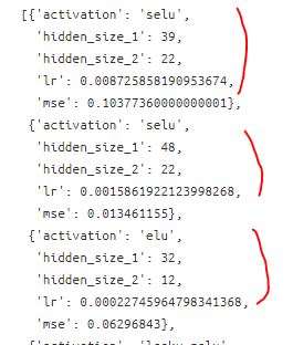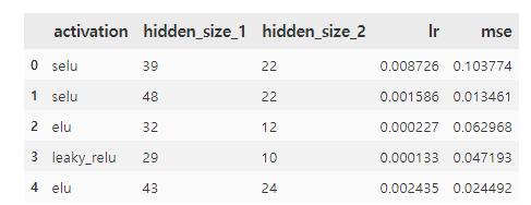 일단 elu이면 좋아 보이고 hidden_size은 42 ~ 45가 적당해 보이고 두 번째는 21에서 24 그리고 learning rate은 0.001에서 0.002 사이가 적당해 보인다.