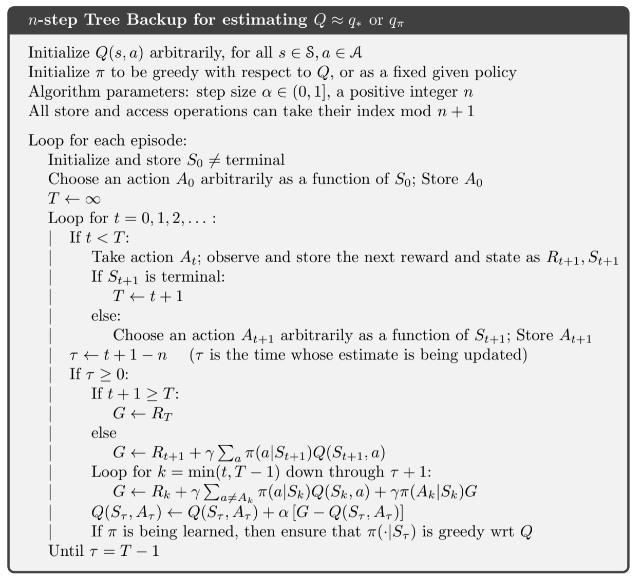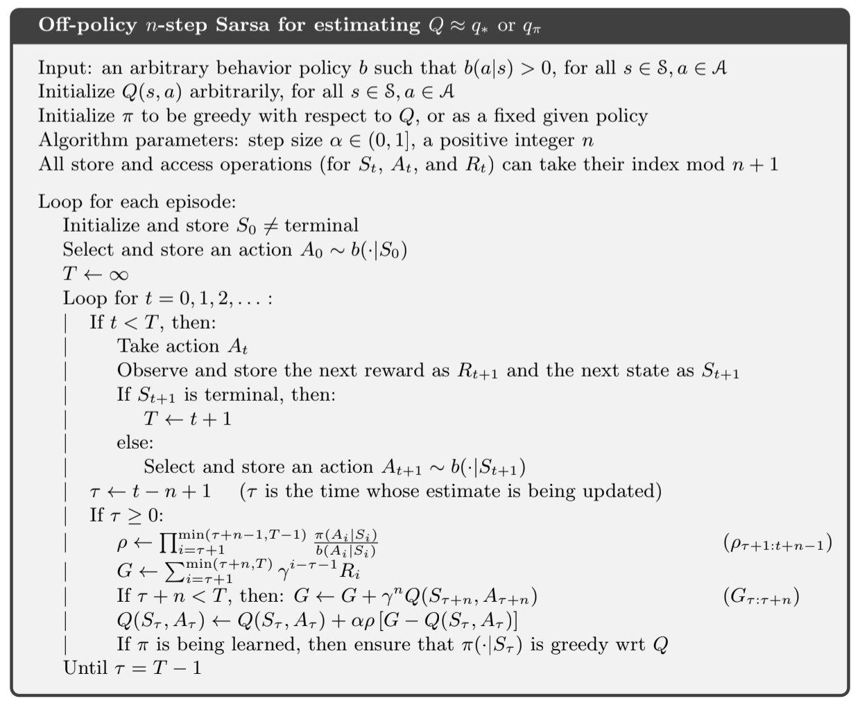 Q[n_step_store["states"][tau]][n_step_store["actions"][tau]] += alpha * rho * (G - Q[n_step_store["states"][tau]][n_step_store["actions"][tau]])