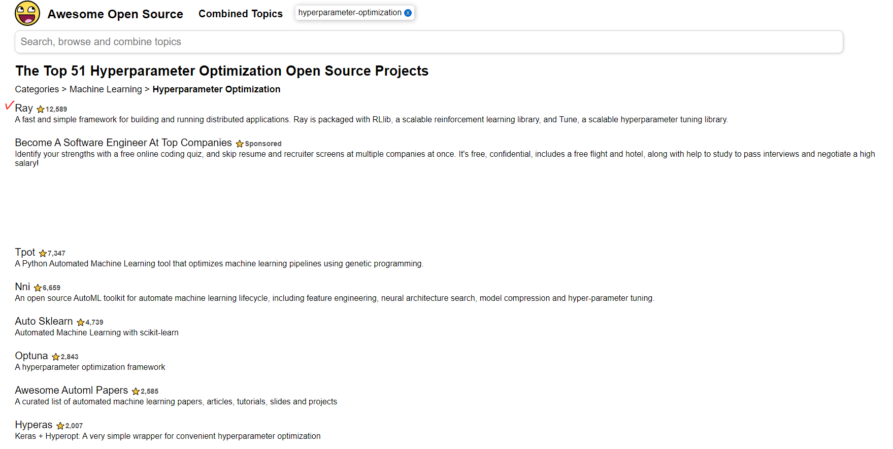 해당 사이트는 hyper parameter optimization 말고도 여러 개의 토픽에 따라 정리를 해놓은 것이 있다.