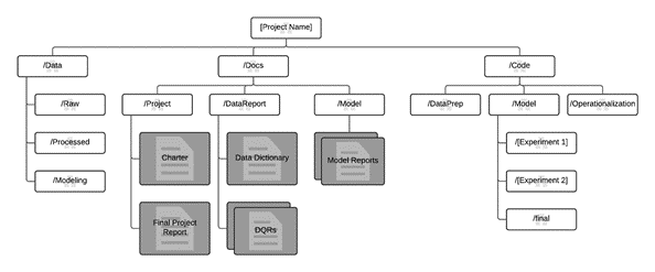 구조화된 디렉터리 레이아웃은 ML 프로젝트에서 데이터 과학 팀의 마음을 구성하는 데 유용합니다. 프로젝트를 시작할 때 미리 작업을 레이아웃 할 방법을 생각하고 이를 표준화된 프로젝트 구조로 문서화하는 데 시간을 투자하는 것이 유용합니다 (Ericson et al 2020.) [6]. 프로젝트 진행 중에 디렉터리의 이름을 변경하거나 추가하거나 삭제해야 하는 상황에서 구조가 견고하지 않기 때문에 괜찮습니다. 하지만 나머지 팀원에게 이를 제기할 수 있는 방법이 있어야 합니다. 변경을 승인할 수 있습니다. 단독 프로젝트를 진행하거나 단독 실무자로서 작업하는 상황에서도 프로젝트를 진행하면서 사고 과정을 추적할 수 있도록 변경 사항을 메모하는 것이 좋습니다.