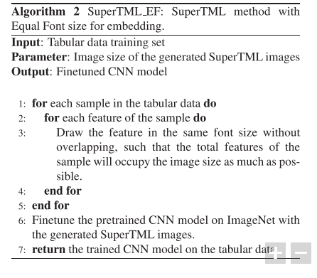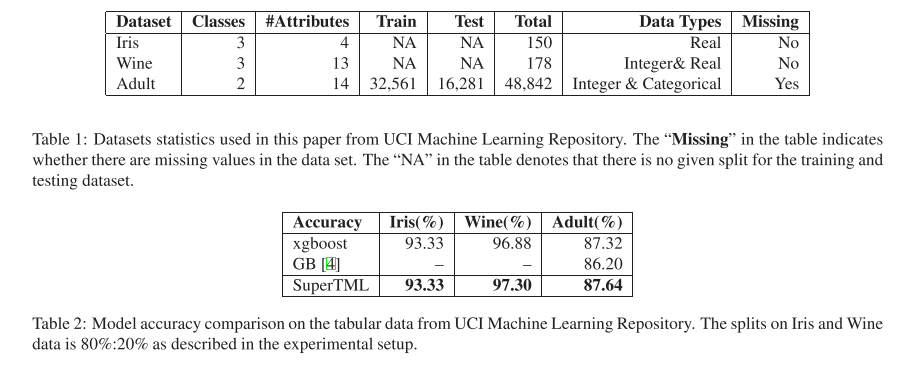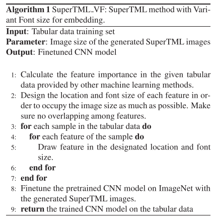 제안된 SuperTML 방법은 숫자 값으로 전처리 할 필요 없이 표 형식 데이터의 범주형 데이터와 결측 값을 자동으로 처리
